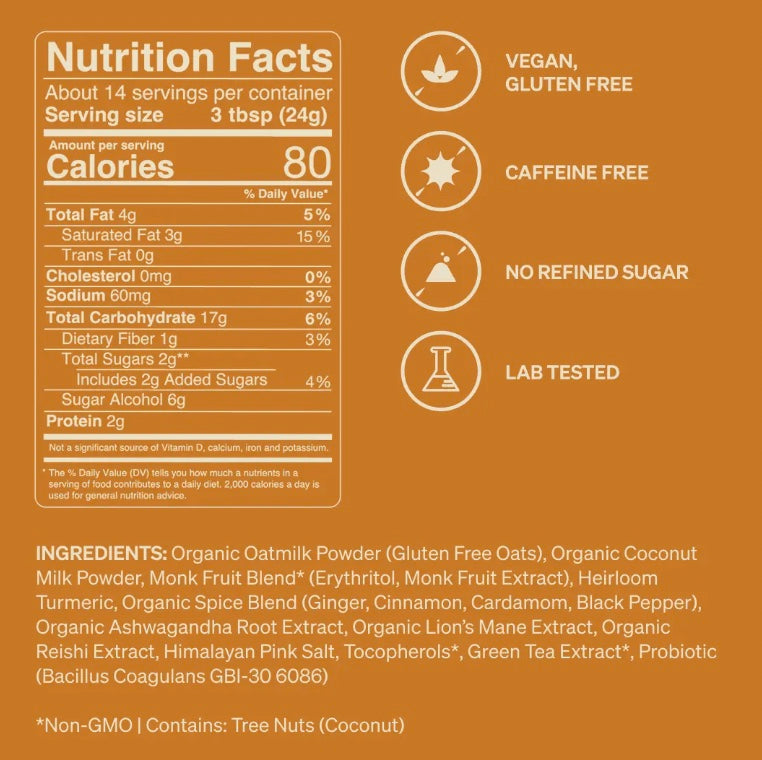 Ingredients: Organic Oatmilk Powder (Gluten Free Oats), Organic Coconut Milk Powder, Monk Fruit Blend* (Erythritol, Monk Fruit Extract), Heirloom Turmeric, Organic Spice Blend (Ginger, Cinnamon, Cardamom, Black Pepper), Organic Ashwagandha Root Extract, Organic Lion’s Mane Extract, Organic Reishi Extract, Himalayan Pink Salt, Tocopherols*, Green Tea Extract*, Probiotic (Bacillus Coagulans GBI-30 6086)