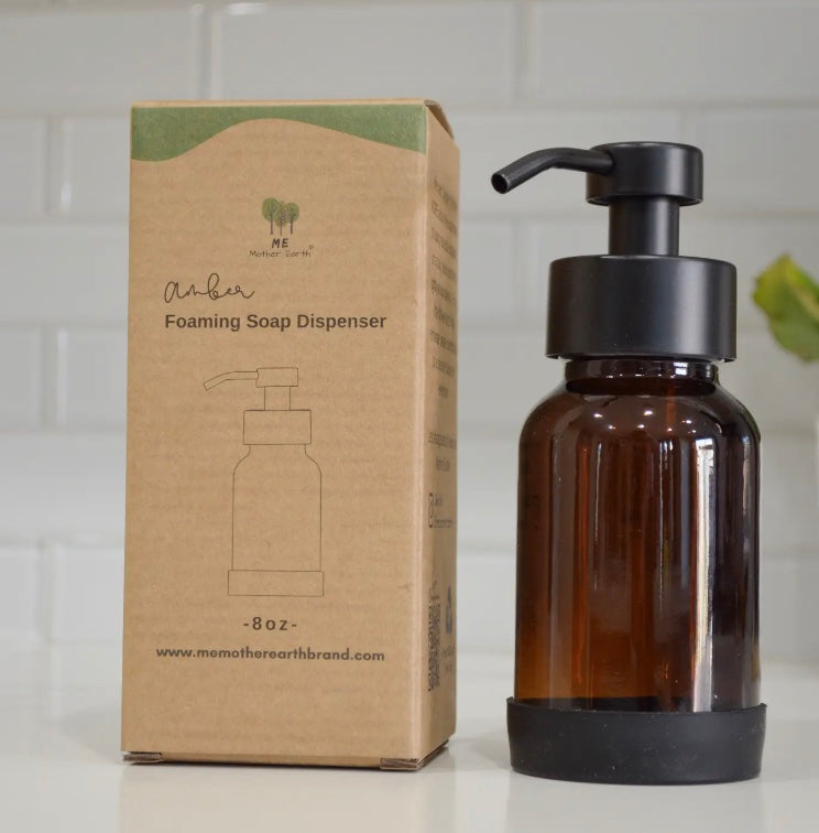 Looking for a high quality foaming soap pump that lasts? Try our amber foaming soap dispenser! Made from high quality stainless steel, amber glass, with a silicone base. The pump has minimal plastic components and is built to last. Amber glass protects essential oils from UV rays. Recommended: Fill with our liquid castile soap for a foamy hand, body, and dish soap.