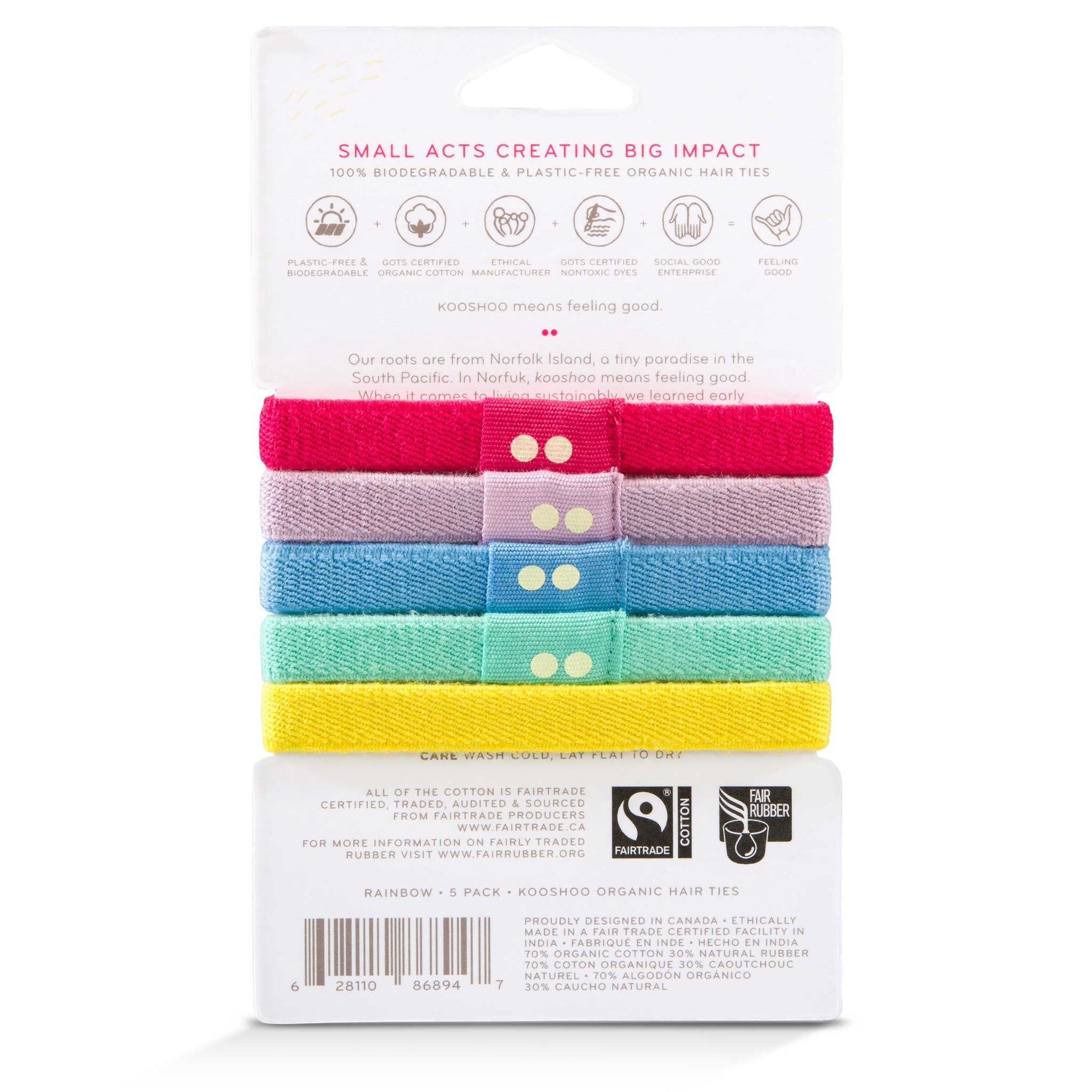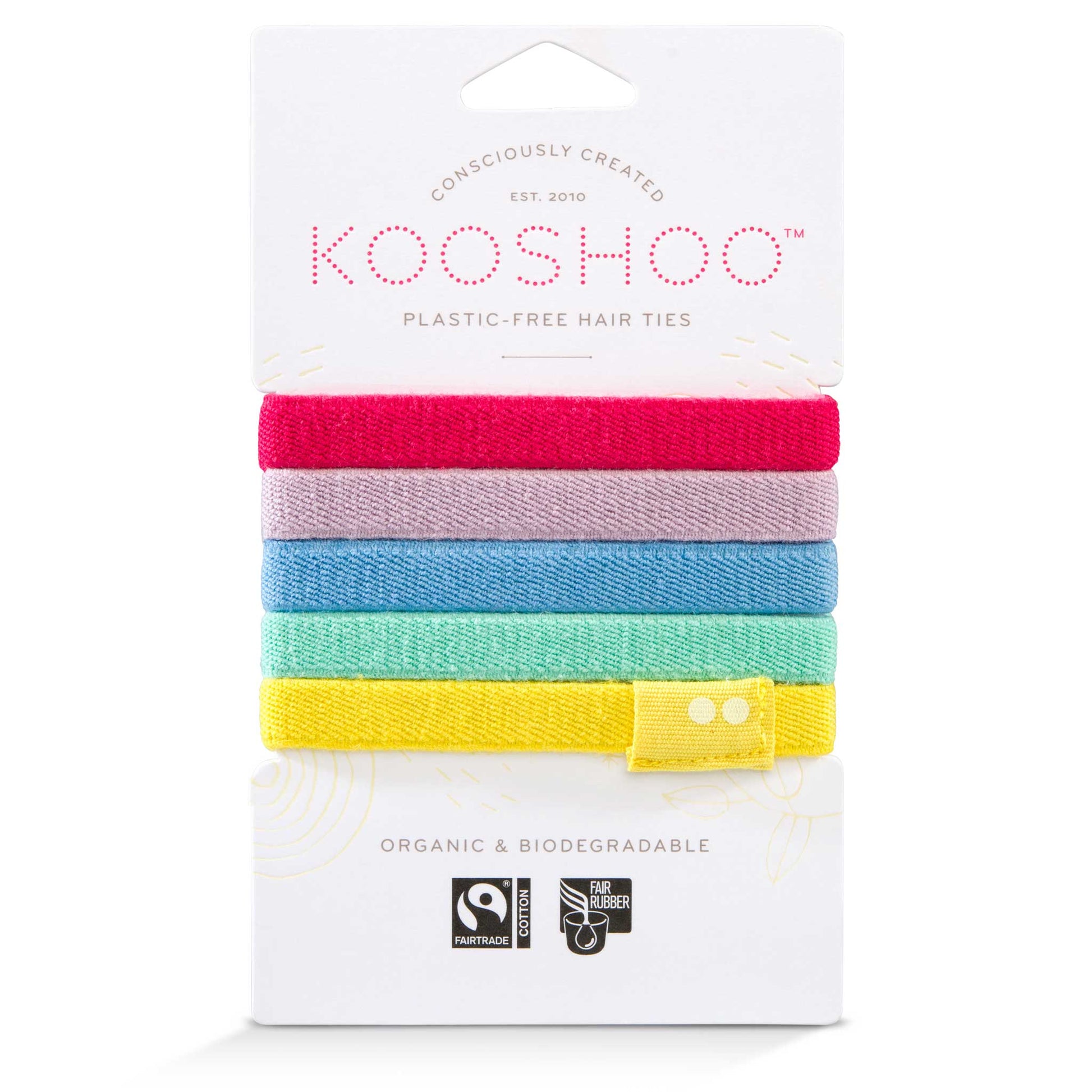 KOOSHOO hair ties are over 3x stronger than your average hair tie, gentle on hair, great for all hair types, eco-friendly, 100% plastic free, vegan, and fair-trade. Made from 100% biodegradable materials.